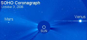 COMET C/2006 T1 (LEVY): Proving that fancy CCD cameras are not required to discover comets, David H. Levy of Tucson, AZ, reports his visual discovery with a 0.41-m reflector of a diffuse comet close to Saturn in the sky: ephemeris. The new comet glows like a 10th magnitude star, making it an easy target for medium-to-large backyard telescopes. Ref: IAU Circular 8757. FULL DAWN MOON: When looking at the Moon, the best place to train your telescope is the day-night terminator, where the long shadows of lunar dawn create beautiful contrasts of light and dark. Consider the following: What would the Moon look like if it were dawn everywhere, all at once? Here is the answer: This unusual image was created by French photographer Ivan Goncalves. He made it by stitching together strips of dawn from photos he took of ten different lunar phases. Call it the "full Dawn Moon." The full Dawn Moon is the same Moon we see every month--same mountains, same craters, same lava seas. Yet it looks strangely different. Two nights from now the full Harvest Moon will appear. Save this photo and compare the two. CONVERGING PLANETS: Venus and Mars are converging on the sun. You can't see the event with the naked eye, but SOHO can. The spacecraft has a coronagraph onboard able to block the sun's glare and reveal nearby stars and planets: As October unfolds, Mars will approach the sun from the left, Venus from the right, eventually forming a compact triangle less than one degree wide. Dates of closest approach: Oct. 23rd - 27th. Mark your calendar and join SOHO for a ring-side seat. |